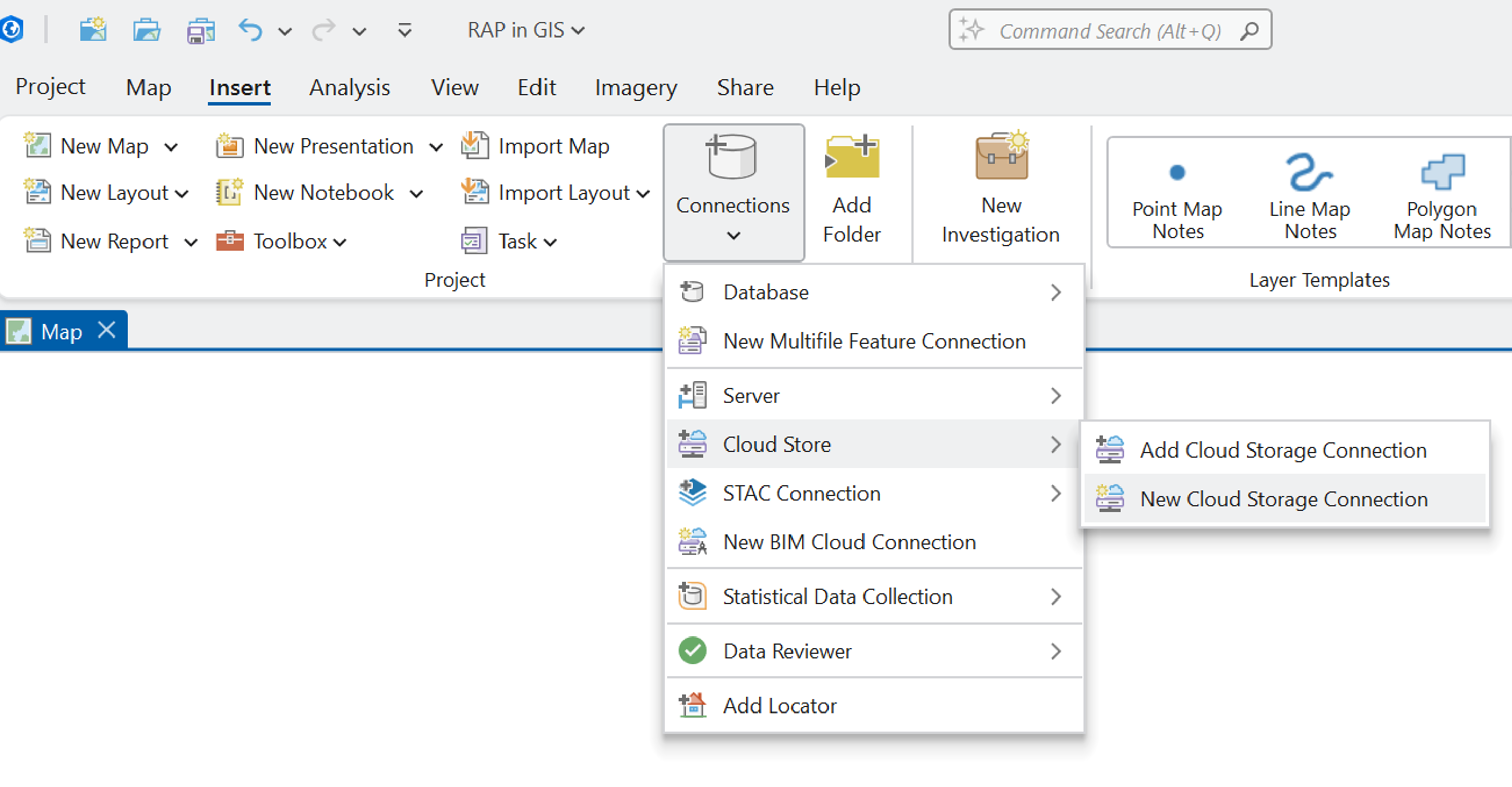 1. In ArcGIS Pro, click the Insert tab to open the Insert tool ribbon. Under Connections, select Cloud Store and then “New Cloud Storage Connection”.