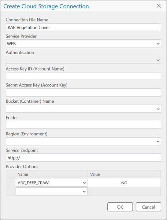 Give the new connection a name in the Connection File Name box. Select “Web” from the Service Provider Menu. Type in the URL (listed above) for the desired dataset in the Service Endpoint box. Provider Options do not need to be changed.