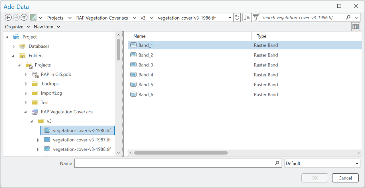 2. Under Project > Folders > Projects, find the connection you just created. Select the GeoTiff and band you wish to load (e.g. "vegetation-cover-v3-1986.tif" and "Band_1"). Click “OK”.