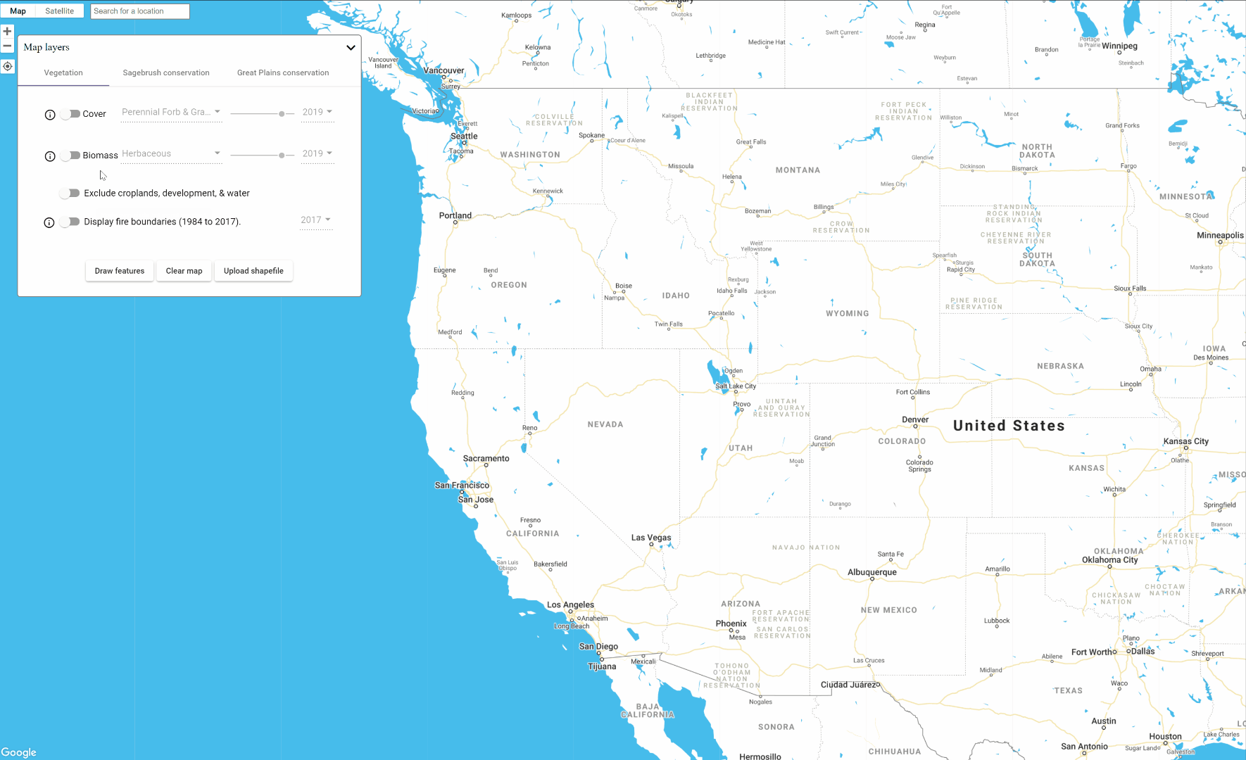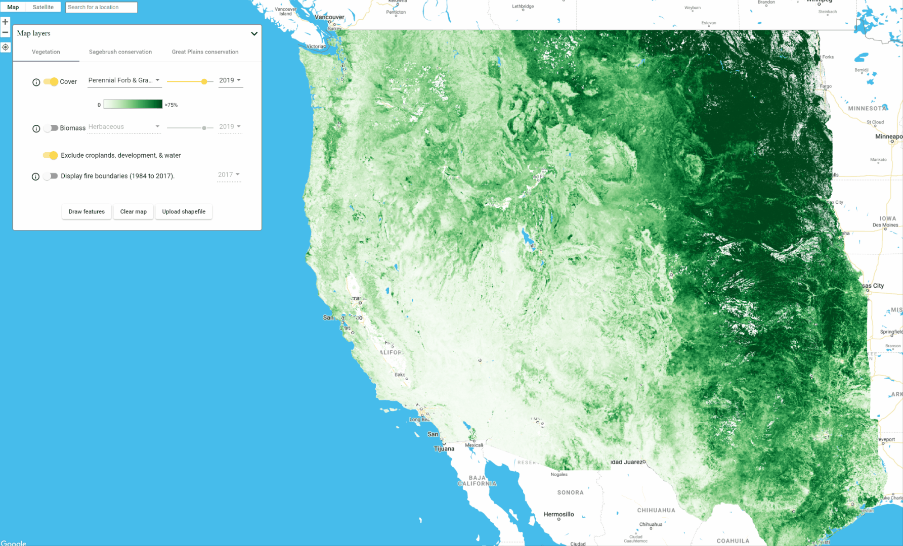 Mapping annual aboveground biomass follows essentially the same procedure as mapping vegetation cover described in the previous section. To toggle to Biomass mapping, click the switch next to Biomass in the Map Layers Panel. Then you will have three data layers available to you: