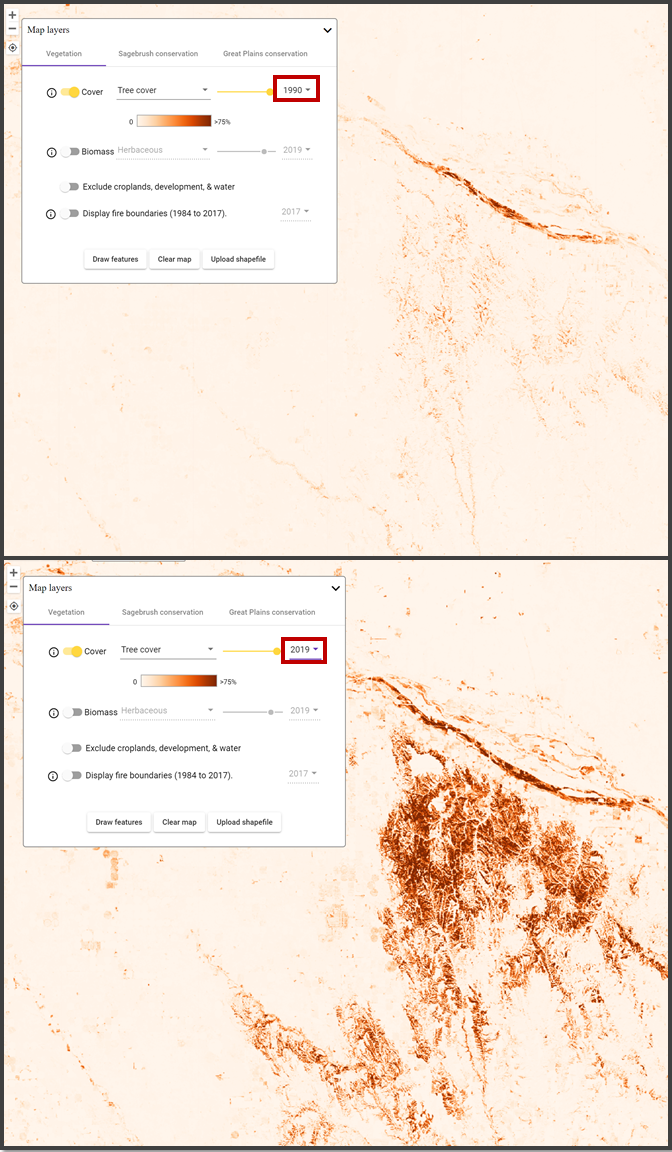 To evaluate tree cover in the Loess Canyons, we select the tree cover layer and use the "year" dropdown (highlighted in red in the maps below) to compare tree cover in 1990 to that of 2019. Immediately, we can see that tree cover is much more widespread today than it was 30 years ago. You are also encouraged to explore the incremental change that has occurred between those two years using the year dropdown menu.