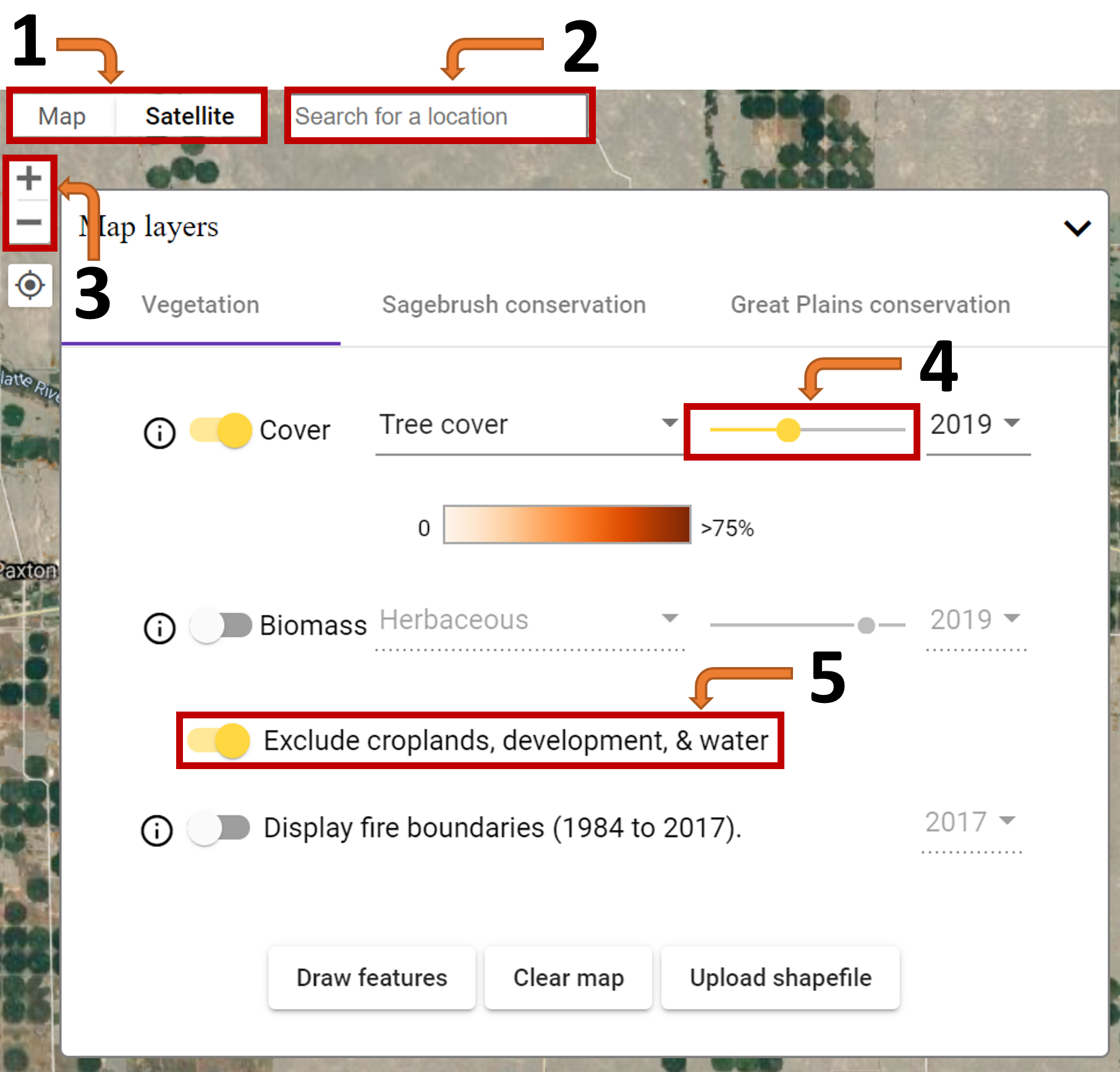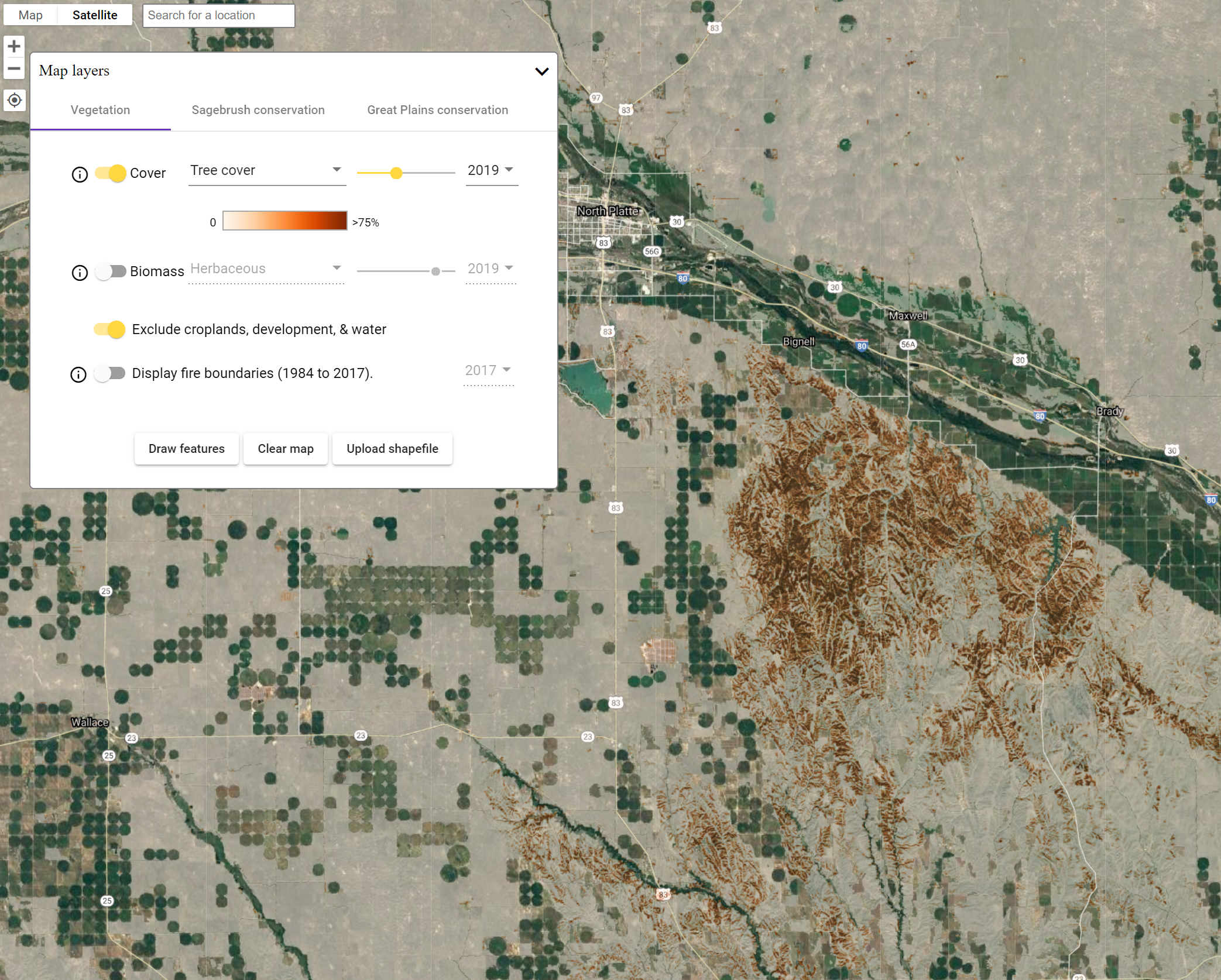 After toggling the basemap to satellite imagery, adjusting the transparency, and removing croplands, developed land, and water, our map of the Loess Canyons from earlier now provides a better context for the landscape within which tree expansion has occurred.