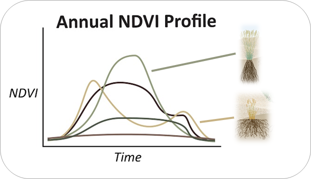 Photosynthesis is the process that plants use to convert absorbed solar radiation to biomass. The amount of energy absorbed is related to the amount reflected, which we can measure using Landsat satellite data. Specifically, we use the normalized difference vegetation index (NDVI) to estimate the amount of radiation absorbed through the growing season (every 16 days), enabling us to estimate biomass production in near-real-time. Then, we use the RAP vegetation cover dataset to parse out how much of that NDVI signal is coming from each vegetation type.