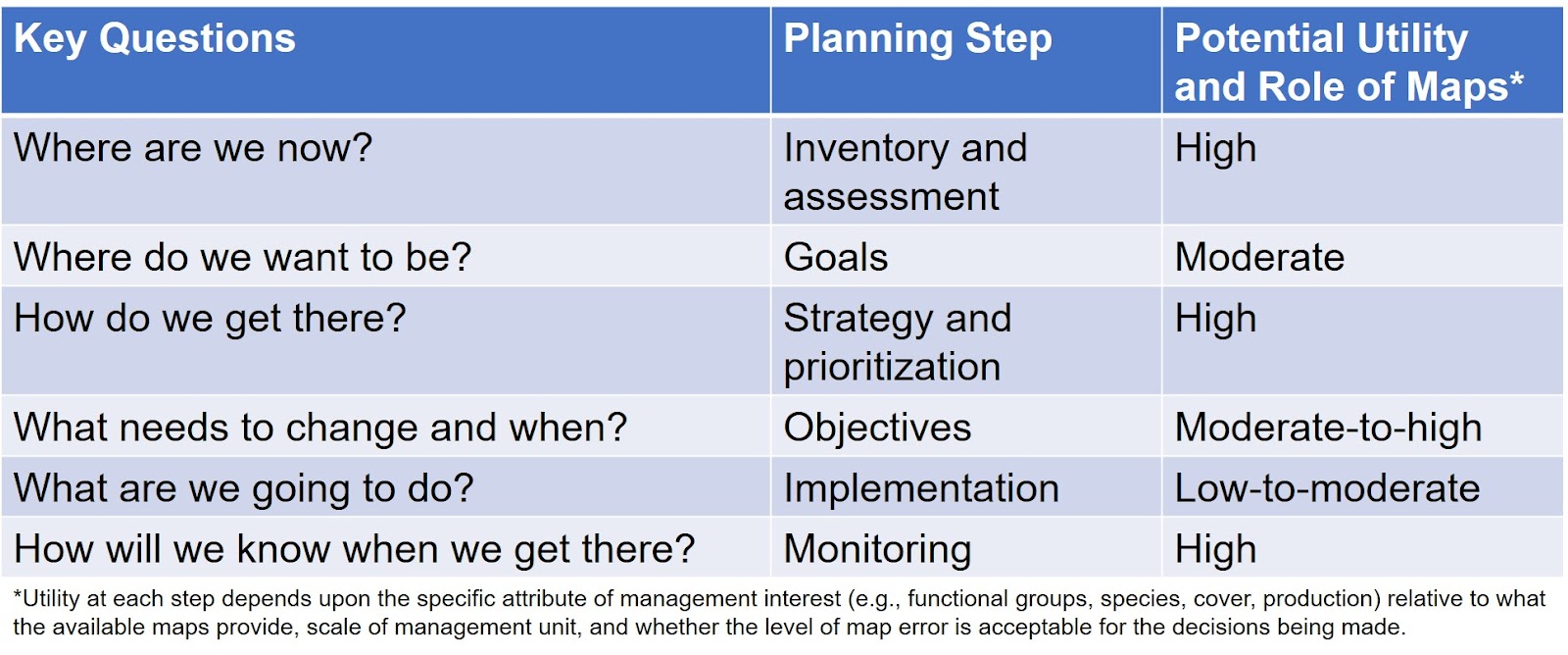 The potential utility and role of RAP data and maps will vary depending on the specific management questions, objectives, and scales involved in a given rangeland planning process. Different tools and sources of information are better suited to inform various questions, and RAP will not be the best tool for every application. Below are some key questions asked during typical rangeland planning and the relative utility of remotely-sensed maps like RAP: