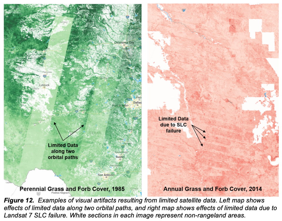 When Landsat satellite data is missing, the vegetation cover model will continue to predict cover. Although newer versions of the vegetation cover model are better equipped to handle missing data, RAP data and output should be examined for anomalies or gaps.