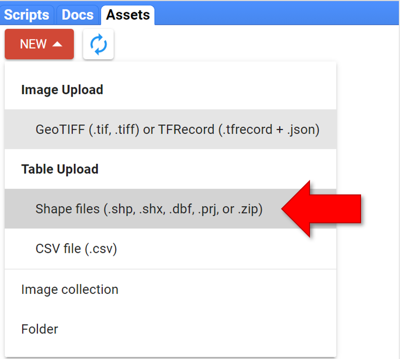 - Click on the Assets tab in the left-side window and then click the New button and select Shape files.