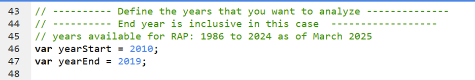 - The yearStart and yearEnd variables on lines 46 and 47 of the script define the first and last years of data that will be exported. The example below exports data for every year between 2010 and 2019.