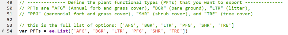 - The PFTs variable on line 54 of the script is a list of the plant functional types (PFTs) that you want to export. You can either keep the entire list if you want to export all of them or remove any PFTs that you are not interested in.