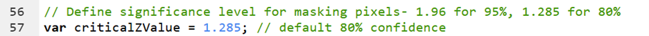 - Change the critical z value based on the desired confidence interval for masking out insignificant pixels. For example, the current default of 1.28 corresponds to a confidence interval of 80%, meaning we can be 80% confident that the true trend differs from zero when a pixel is considered significant (i.e., not masked in the output). Another common, more stringent critical z value is 1.96, which corresponds to a 95% confidence interval.