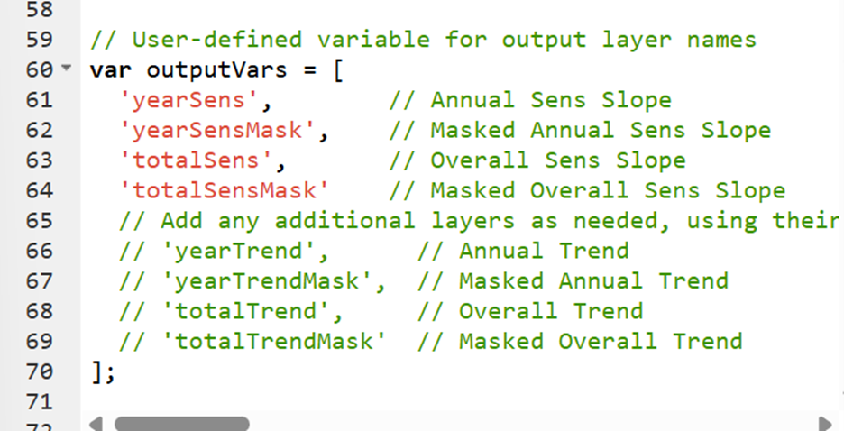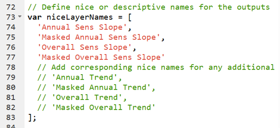 - For example, if I wanted to include the annual trend as an output, I would add a comma after line 64 (‘totalSensMask’,), remove the // and comma from line 66 (‘yearTrend’). I would also perform a similar action to the niceLayerNames variable by adding a comma to line 77, then removing the // and comma from the corresponding name from that layer (line 79).