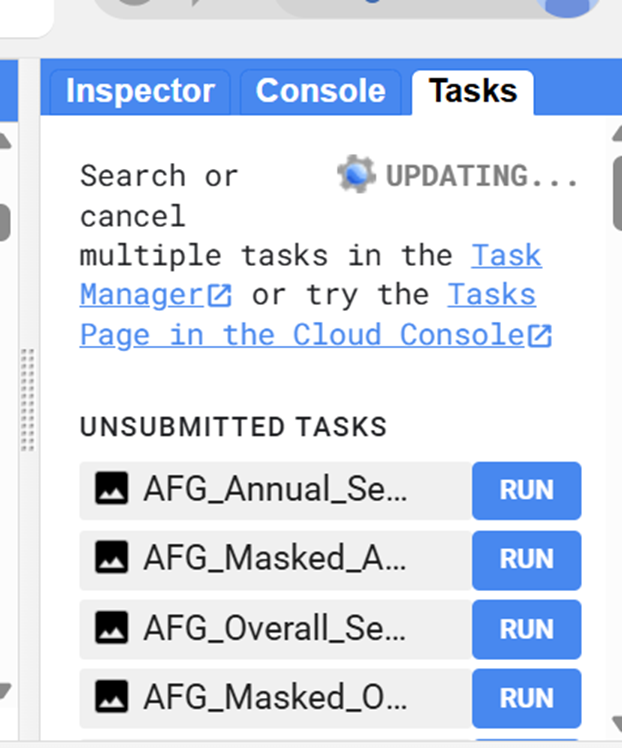 - Almost immediately, the "Tasks" tab in the right-side panel will turn yellow indicating that you are ready to export. When you click "Tasks" you will see a list with items for each layer that you exported. Click "Run" on each of them to begin processing. You can click Run on the export popup to keep the default settings, which will export the raster as a geotiff to the Google Drive linked to your Google Earth Engine account.