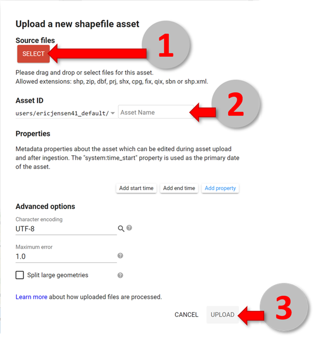 - A pop-up window will open. Follow these steps: 1) Click the SELECT button and upload either a zipped shapefile or each of the file extensions separately (a zipped shapefile is usually easiest), 2) name your new Earth Engine Asset, and 3) leave the remaining items as default, and click UPLOAD.