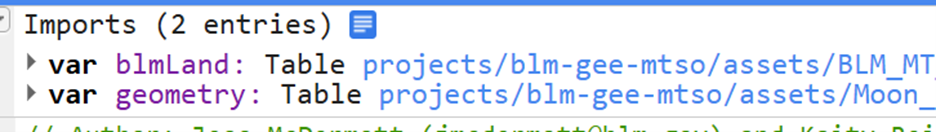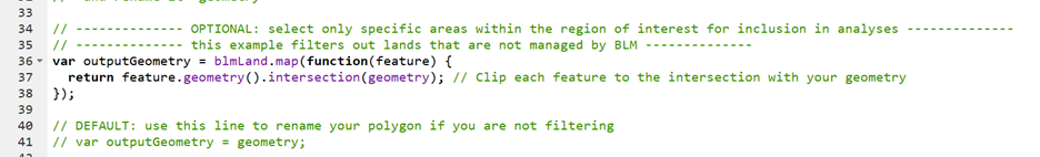- In order to run the script with the additional filter geometry, you will need to rename the polygons imported for filtering “blmLand”, uncomment lines 36-38, and comment out line 41 to resemble the screenshot below.